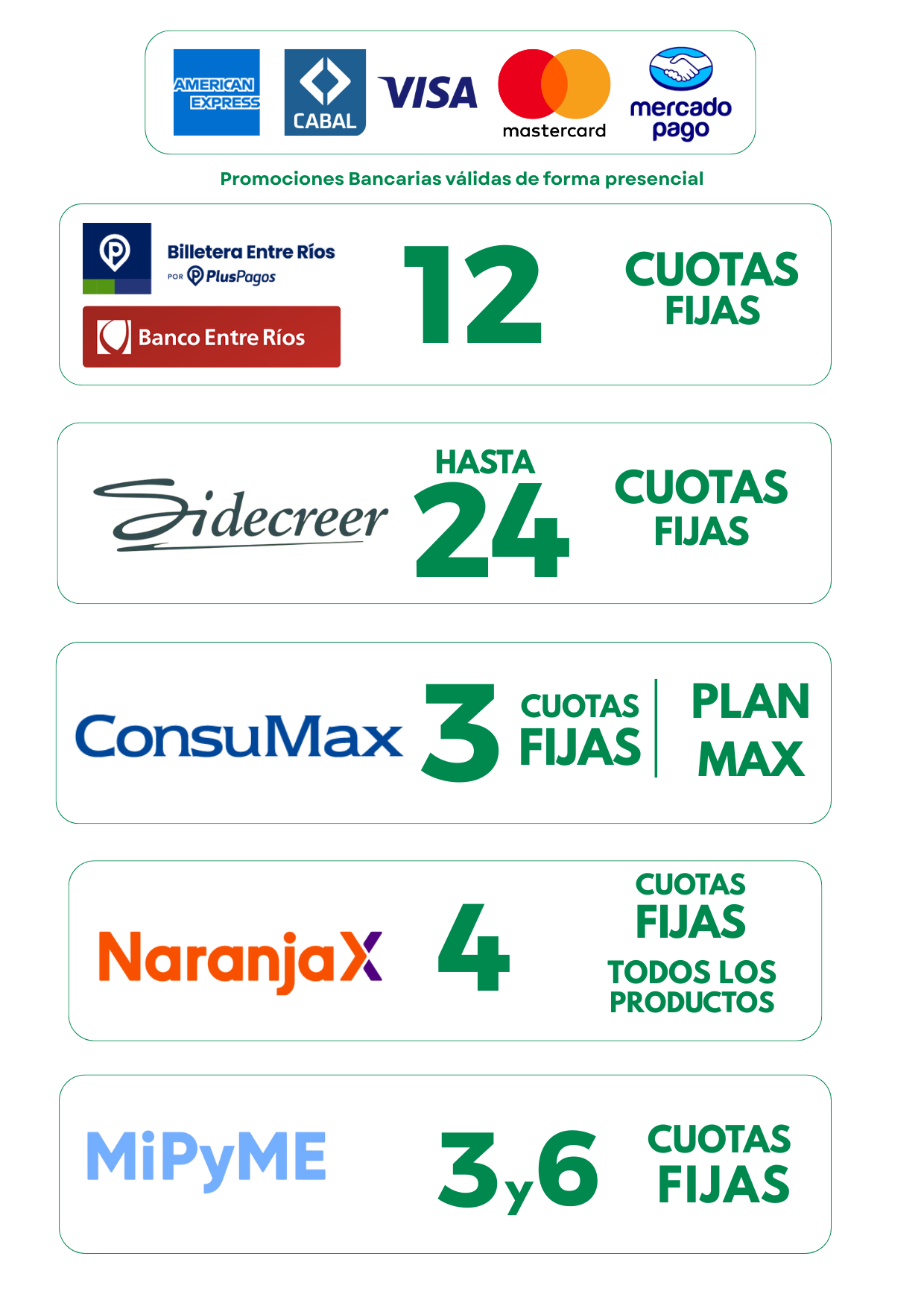 El precio corresponde a pago en efectivo, tarjeta de débito o medios electrónicos. Consúltanos por pagos en cuotas con tarjetas de crédito.