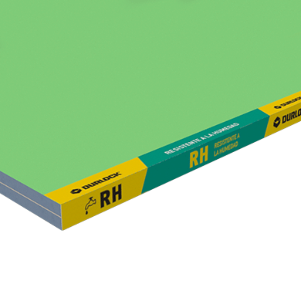 El núcleo de las placas de yeso Durlock® Resistentes a la Humedad tiene el agregado de componentes hidrofugantes. Las placas Durlock® RH se identifican por su cinta protectora de bordes color verde, siendo el papel de la cara expuesta de color verde y el de la cara posterior de color más oscuro.
