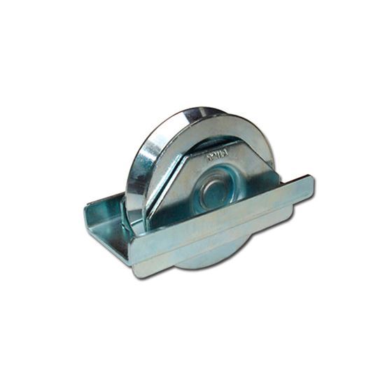 Rueda torneada montada en un rulemán blindado, provista de un puente que se suelda a la estructura del portón y un soporte extraíble para un futuro reemplazo de la rueda.